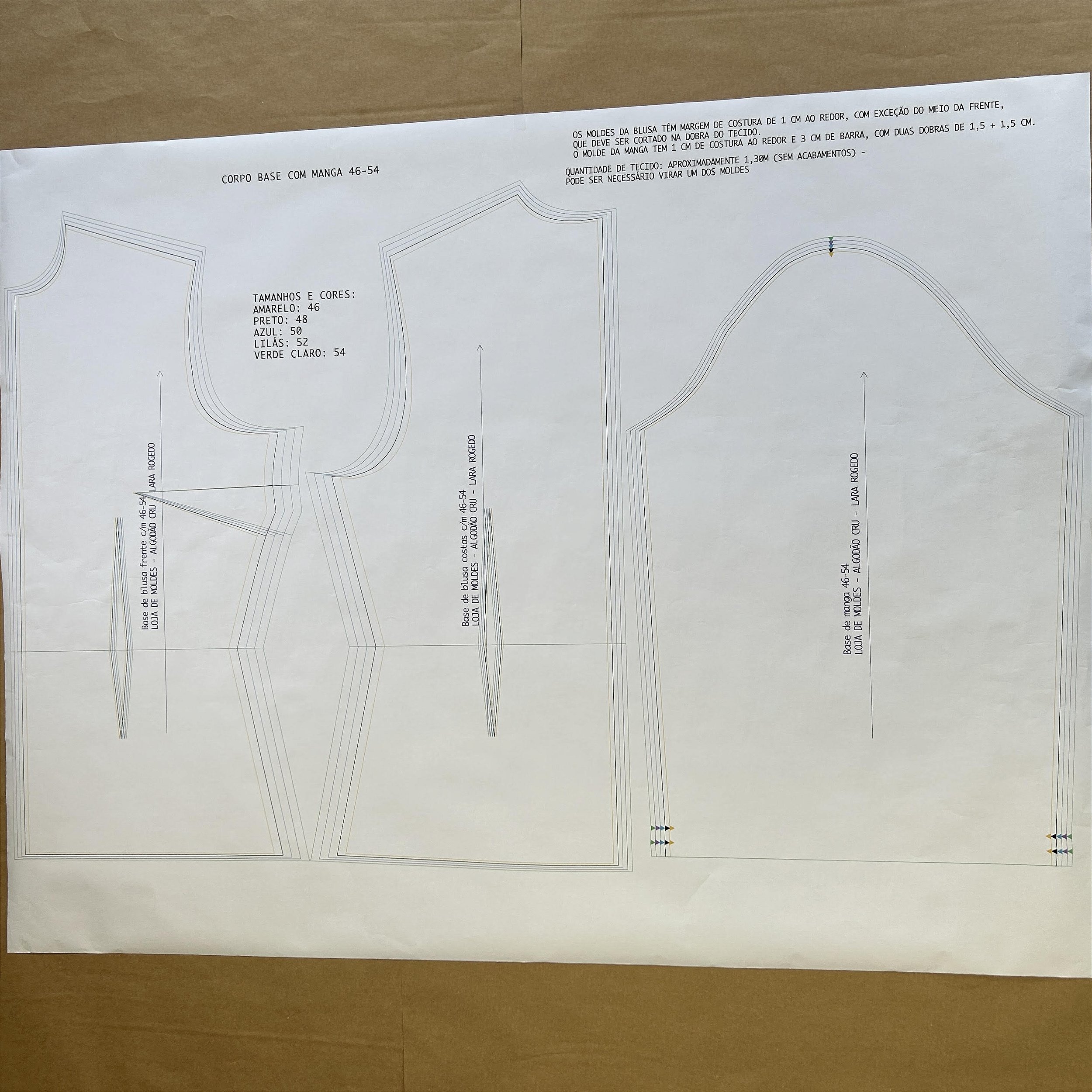Molde base de blusa sem mangas, base de blusa com manga, base de saia, base de calça disponível nos tamanhos 46 a 54, com cada tamanho identificado por linhas de cores diferentes para facilitar a visualização.