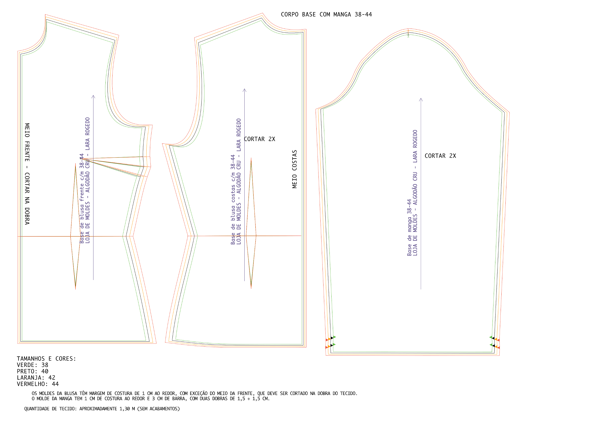 Molde base de blusa com mangas disponível nos tamanhos 38 a 44, com cada tamanho identificado por linhas de cores diferentes para facilitar a visualização.