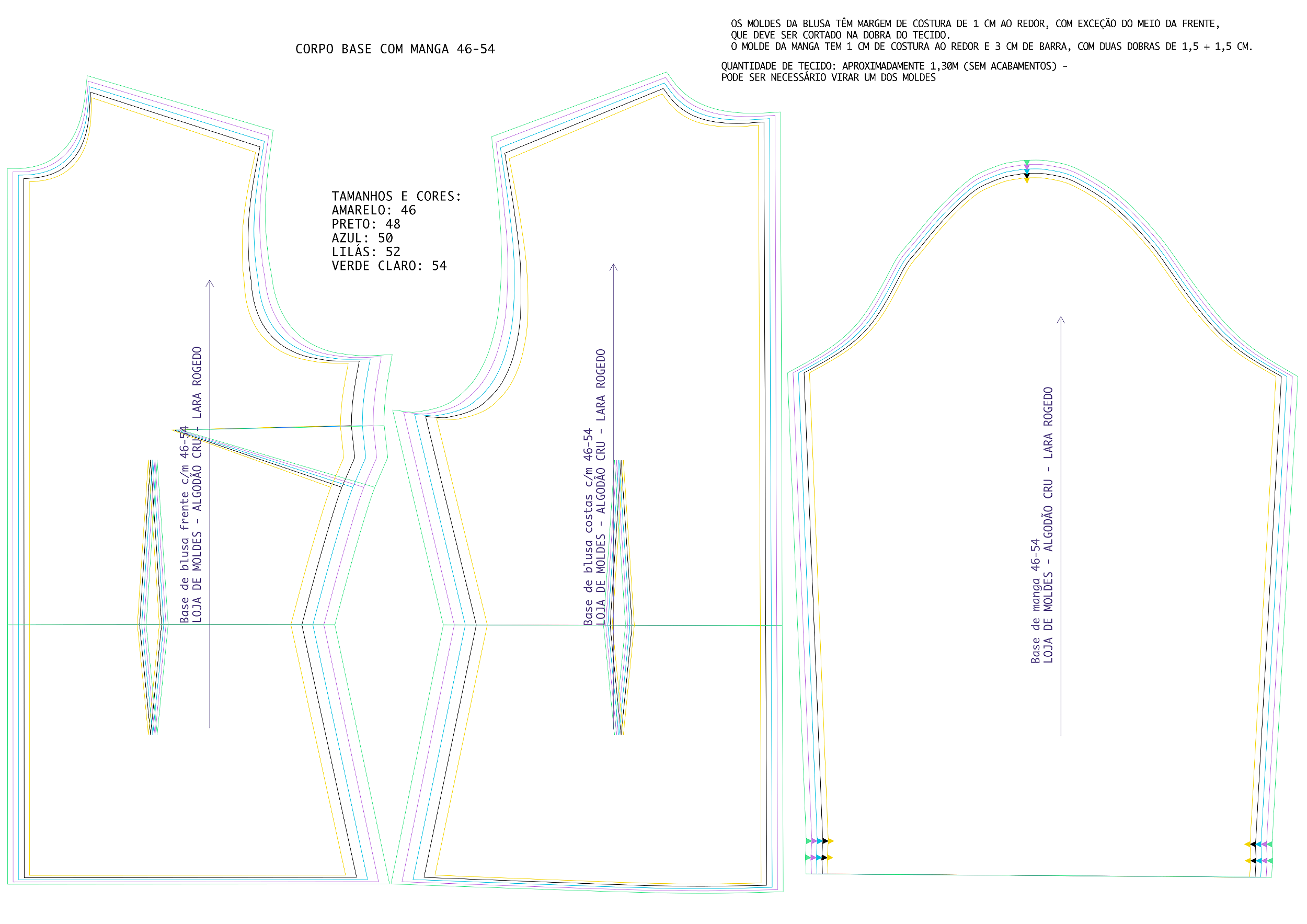 Molde base de blusa com mangas disponível nos tamanhos 46 a 54, com cada tamanho identificado por linhas de cores diferentes para facilitar a visualização.