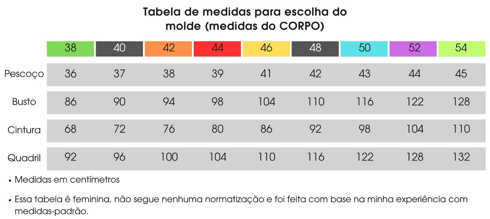 O molde segue uma tabela de medidas padronizada (descrita abaixo). Para garantir o melhor caimento, recomendamos a confecção de uma tela no tamanho escolhido, permitindo ajustes personalizados.